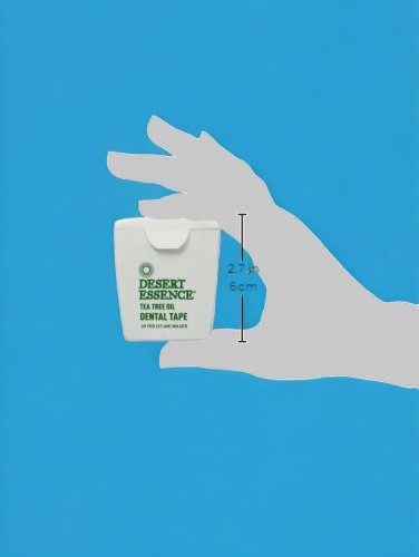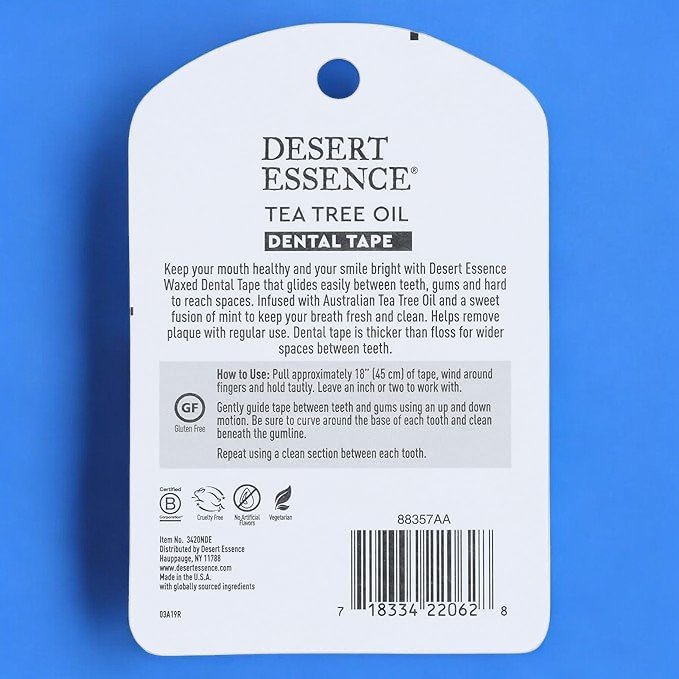 DESERT ESSENCE dental tape features 30 yards of tea tree-infused string that gently glides to clean tight spaces and freshen breath naturally.